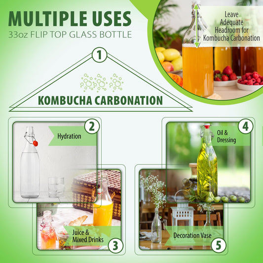 Flip Top Glass Bottle [1 Liter / 33 fl. oz.] [Pack of 6] – Swing Brewing with Stopper for Beverages, Oil, Vinegar, Kombucha, Beer, Water, Soda, Kefir Airtight Lid & Leak Proof Cap Clear